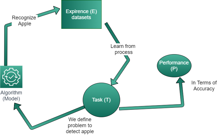 We try to make machine (algorithm) learn from the Expirence(E) for correctly detecting an apple where problem (task T) is measured by performance (P) in terms of accuracy of correctly detecting an Apple.
